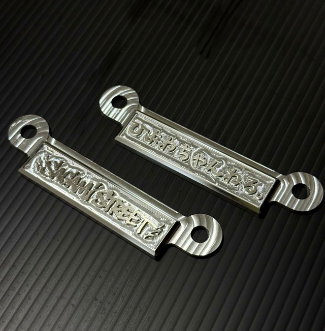 くるくるハンドルにつけられるプレートです。 アルミ削り出し。 ひよわちゃんねる。とサガミストリートの2種! どちらか選んでください。 ※A型のくるくるポストには着きません